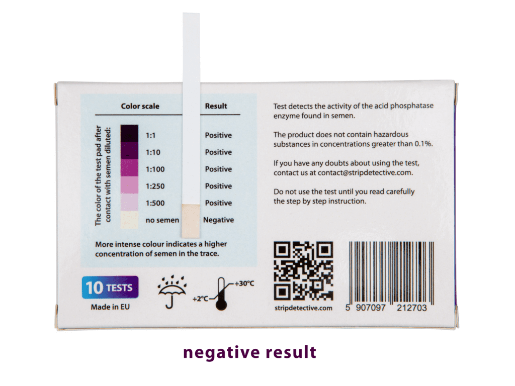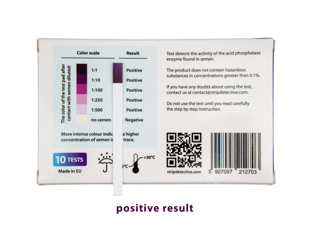 Meet Strip Detective - exeptionally simple sperm presence test. It excludes the presence of sperm with 100% accuracy. You can investigate your material at home, in privacy. The test turns violet if the stain is positive for acid phosphatase (occuring in sperm).