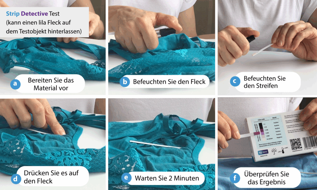 Der StripDetective-Test ist ein professioneller forensischer Test zum Nachweis von Sperma in der Probe. Der Test identifiziert die Aktivität des Enzyms saure Phosphatase, das in hoher Konzentration im Sperma vorhanden ist. Das Vorhandensein dieses Enzyms führt zu einer violetten Verfärbung des Teststreifens. Es ist jedoch wichtig zu bedenken, dass saure Phosphatase auch in bestimmten anderen biologischen Substanzen vorhanden sein kann, sodass das Testergebnis in einigen Fällen trotz fehlendem Sperma positiv ausfallen kann.