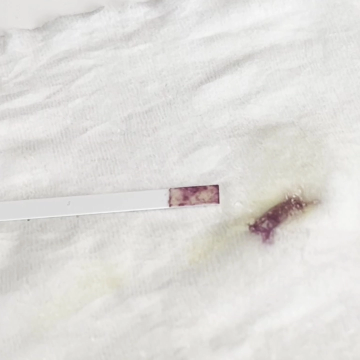 A positive result for acid phosphatase will cause the test field to turn purple. Compare the color of the test with the reference range on the box and check the result.